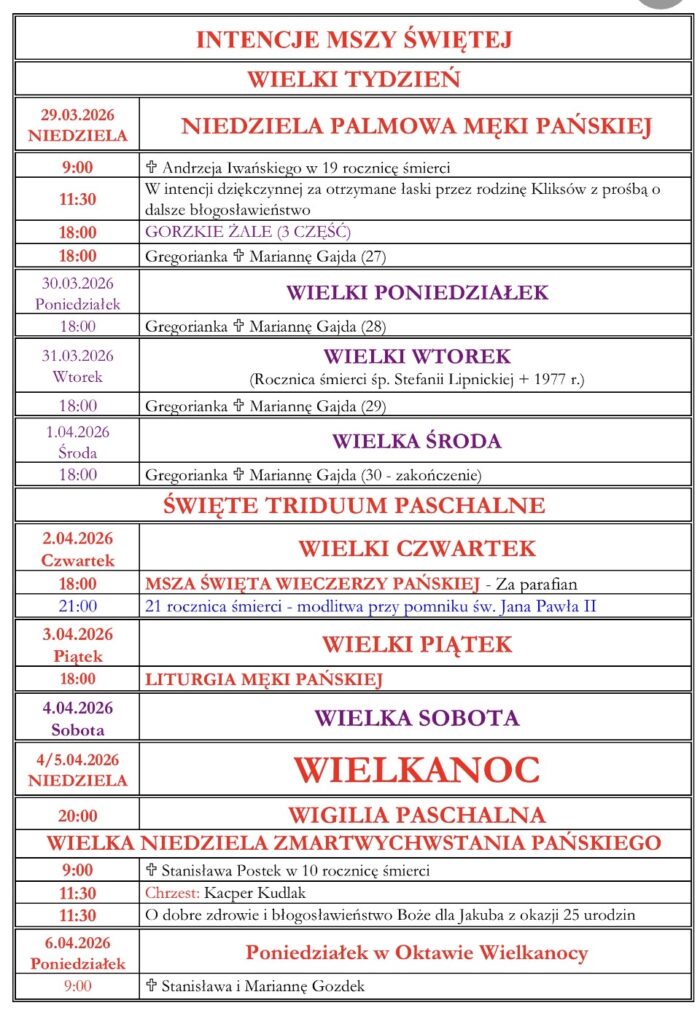 3. Porządek liturgii Świętego Triduum Paschalnego znajduje się na plakacie, który wisi na drzwiach do kościoła oraz w Gazetce Parafialnej a także na stronach internetowych parafii. Zachęcam do udziału w Liturgii Godzin oraz do modlitwy osobistej podczas tych trzech świętych, bardzo ważnych i wielkich dni.