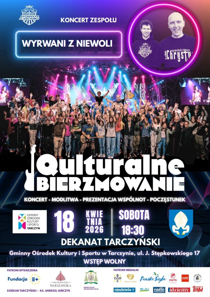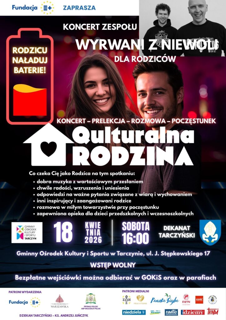 18. Parafia św. Mikołaja w Tarczynie z księdzem dziekanem Andrzejem Juńczykiem serdecznie zaprasza wszystkich rodziców z naszej parafii na wyjątkowe wydarzenie muzyczne pt. Qulturalna Rodzina. Wydarzenie to organizowane jest z myślą o rodzicach, szczególnie dzieci przygotowujących się do I Komunii Świętej oraz młodzieży przygotowującej się do bierzmowania. Osią spotkania będzie koncert znanego i cenionego w całej Polsce zespołu „Wyrwani z niewoli”. Poza muzyką i słowem artystów uczestnicy będą mieli możliwość poznać wspólnoty parafialne działające w najbliższym sąsiedztwie. Koncert odbędzie się 18 kwietnia (w sobotę) o godz. 16.00 w Gminnym Ośrodku Kultury i Sportu w Tarczynie. Na koniec spotkania przewidziany jest poczęstunek i czas na rozmowy indywidualne. Podczas wydarzenia zapewniona będzie opieka dla dzieci przedszkolnych i wczesnoszkolnych. Udział w tym wydarzeniu jest dla uczestników bezpłatny.