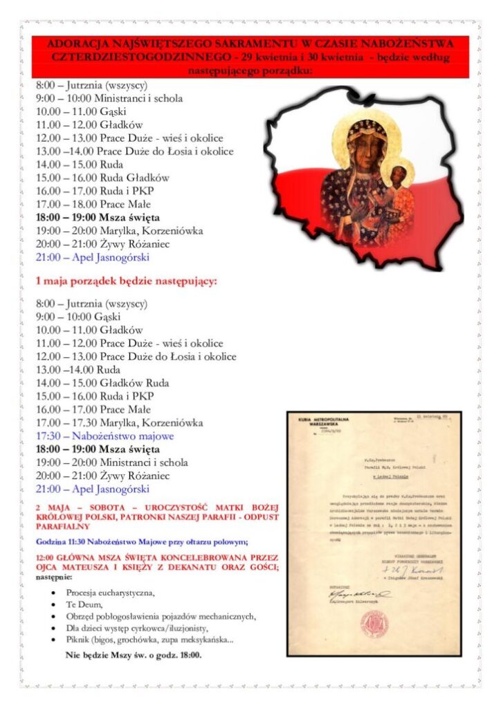6. Na drzwiach do kościoła wisi plakat z informacjami na temat Nabożeństwa 40-godzinnego, które odbędzie się 29 kwietnia, 30 kwietnia oraz 1 maja. Adoracja Najświętszego Sakramentu poprzedza Odpust Parafialny ku czci Najświętszej Maryi Panny, Królowej Polski, Patronki naszej Parafii. Uroczystość Najświętszej Maryi Panny, Królowej Polski w tym roku została przeniesiona z Niedzieli 3 maja na sobotę 2 maja, nabożeństwo majowe będzie przy Ołtarzu Polowym o godz. 11:30 następnie Uroczysta Msza św. koncelebrowana pod przewodnictwem Ojca Mateusza Winciorka SAC (Pallotyna) i Księży Gości oraz Kapłanów z dekanatu tarczyńskiego. W sobotę 2 maja nie będzie Mszy św. o godz. 18:00.